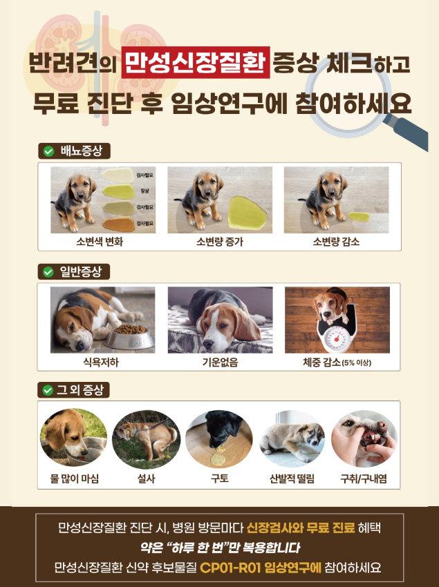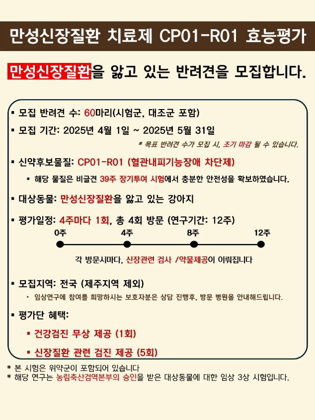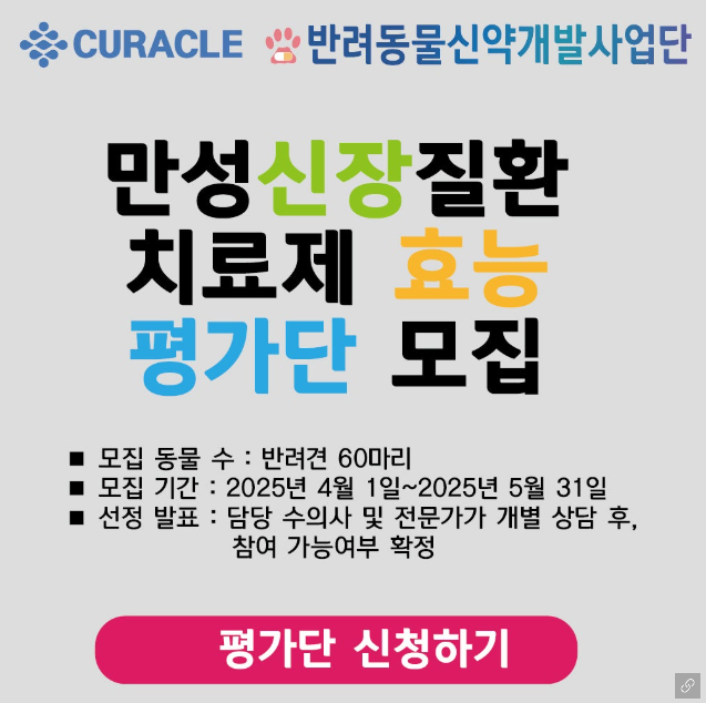 [큐라클 소식] [임상연구]만성신장질환 치료 신약 후보물질 CP01-R01 효능평가 반려견 모집 2025-04-14 11:26:19 본 연구는 농림축산검역본부로부터 임상 3상 시험을 승인받았습니다. 반려견의 만성신장질환(CKD)을 무료 진단 받고, 임상연구에 참여해 보세요. 신청서(클릭)를 작성하시면, 평가단 참여 가능 여부를 판단하기 위해 연구담당 수의사 및 전문가의 개별상담이 진행될 예정입니다. 오기없이 신청서를 작성해 주세요. 문의사항이 있으시면 회사로 연락 부탁드립니다. 목록