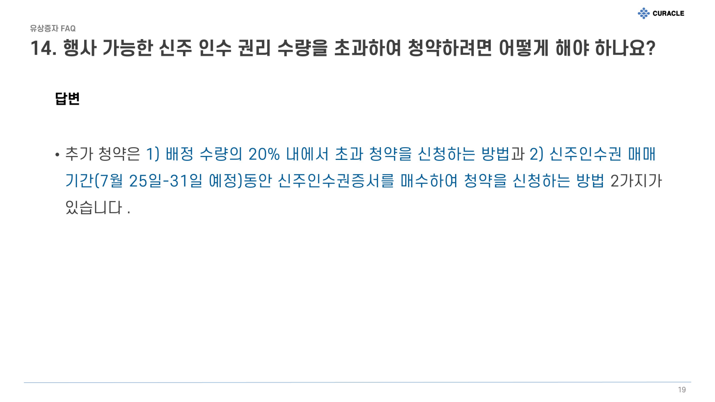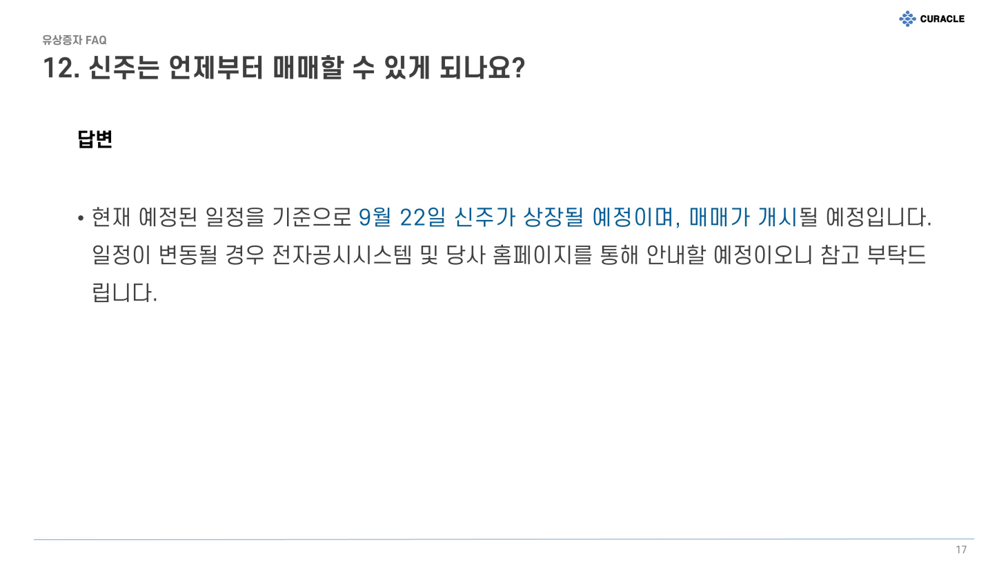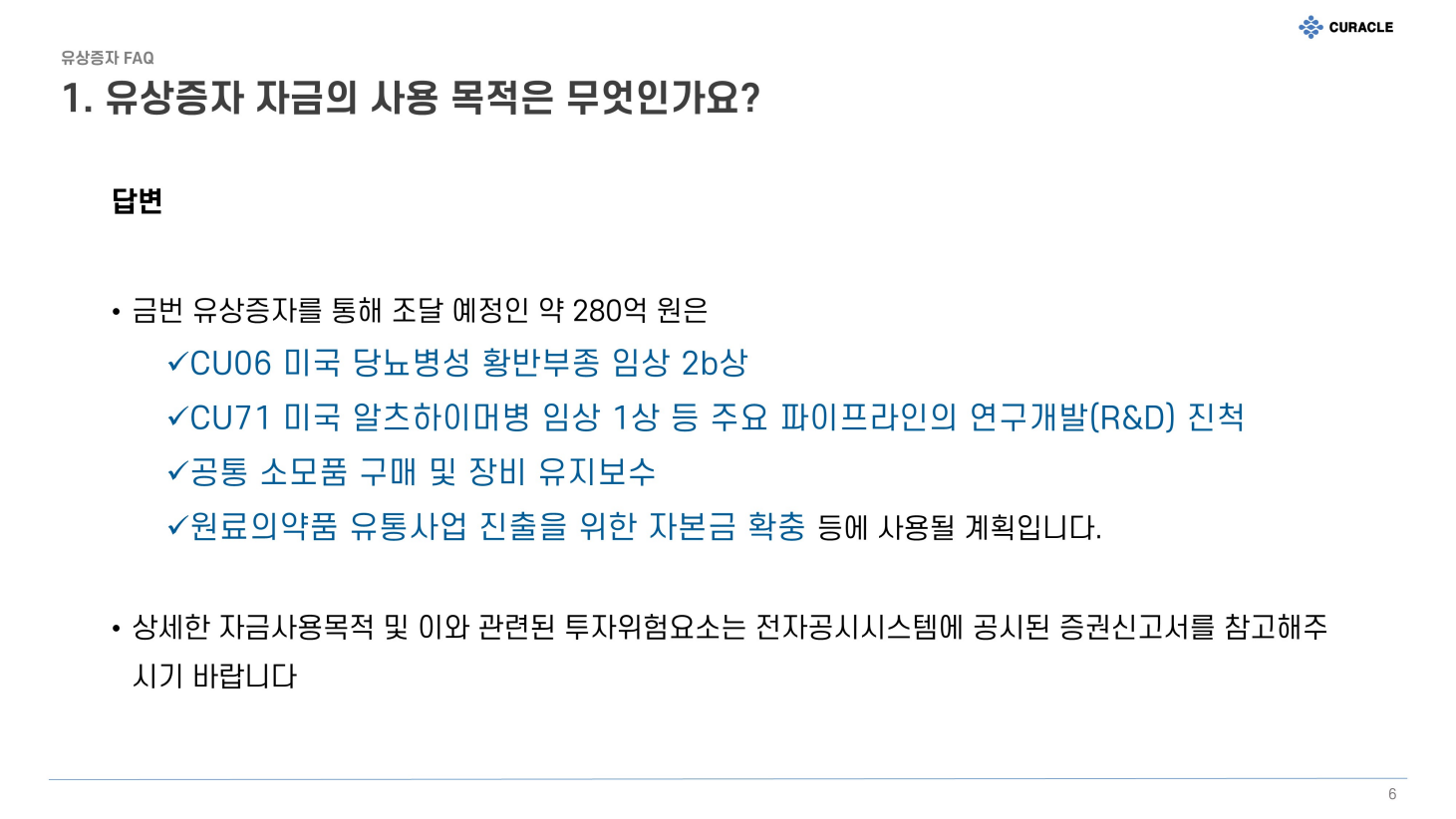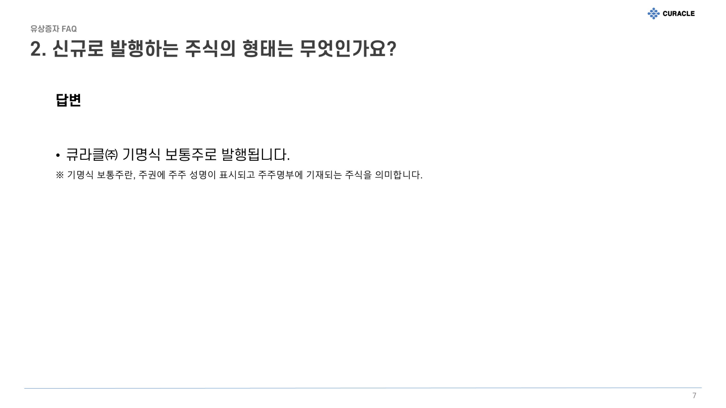 아울러 큐라클 홈페이지를 통해서도 투자자들이 자주 묻는 질문에 대한 답변을 FAQ로 정리하여 주주 분들께 공유해 나가겠습니다.