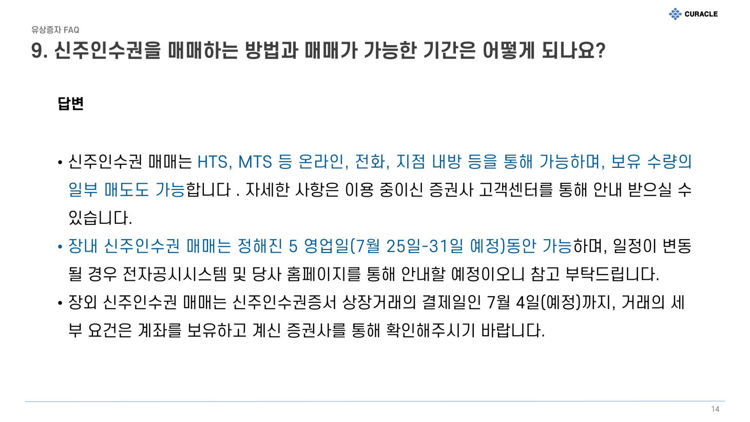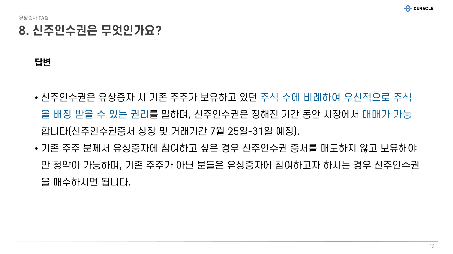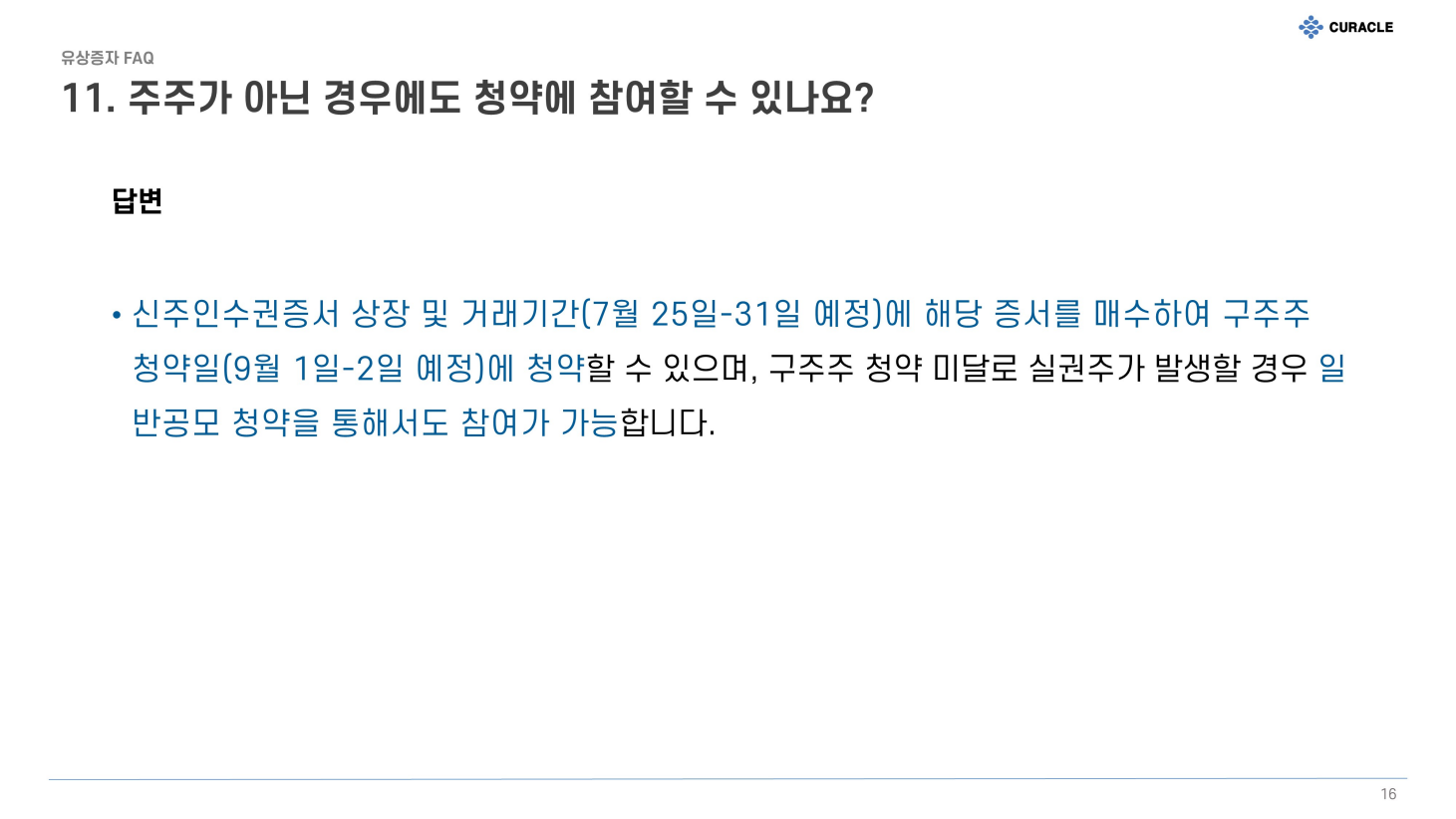 아울러 큐라클 홈페이지를 통해서도 투자자들이 자주 묻는 질문에 대한 답변을 FAQ로 정리하여 주주 분들께 공유해 나가겠습니다.