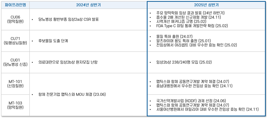 당사는 2024년 상반기 CU06 당뇨병성 황반부종 임상2a상 결과를 발표한 이후, CU06의 후속 개발 뿐만 아니라 연구개발(R&D) 활동 및 오픈 이노베이션을 통해 다수의 파이프라인을 육성하며 탄탄한 핵심 파이프라인을 구축해 왔습니다.