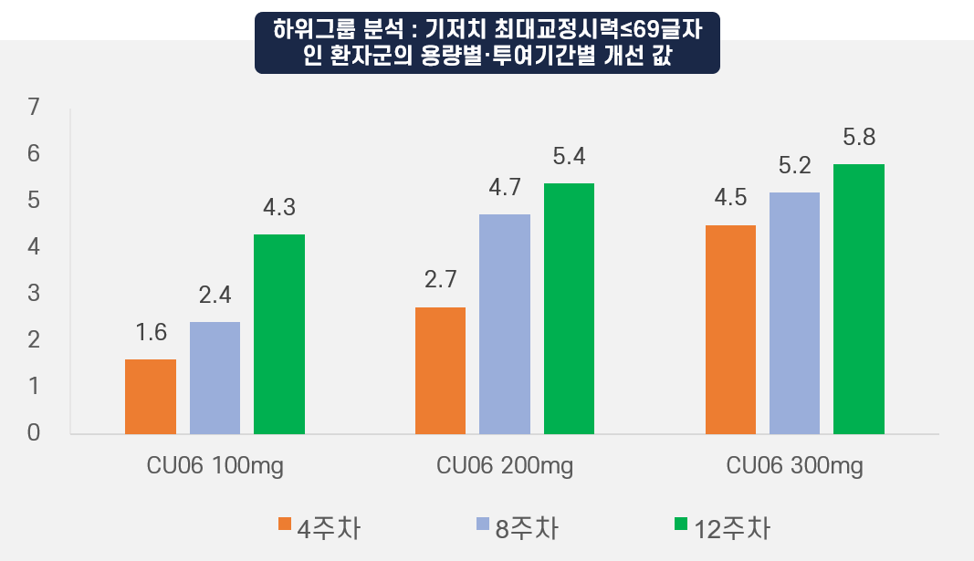 CU06은 임상2a상에서 12주 투여 시 모든 용량군에서 최대교정시력이 증가하는 것을 확인했으며, 특히 상대적으로 시력이 낮은(최대교정시력 69글자 이하) 환자군에서 시력이 5.8글자까지 개선되는 것을 확인했습니다.