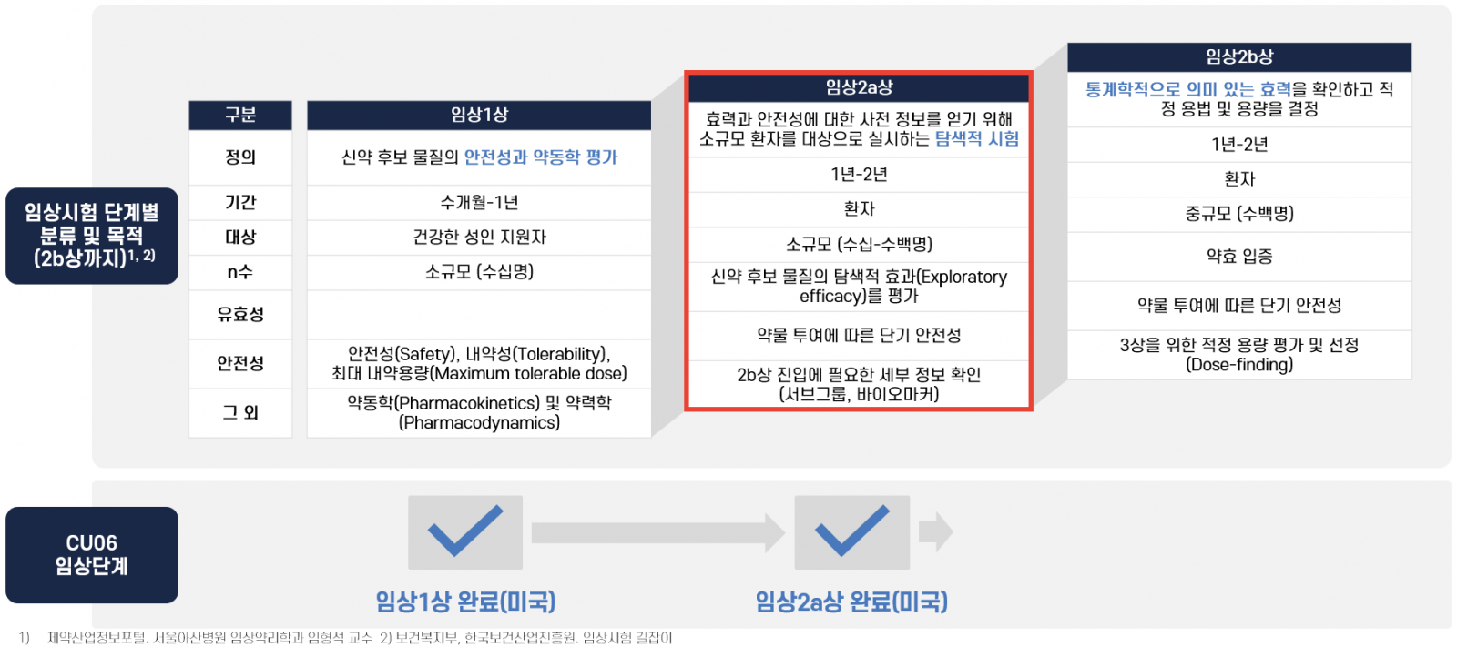 반면 CU06처럼 새로운 치료제나 알려지지 않은 작용 기전을 가진 약물의 경우 임상2상을 2a, 2b상 두 단계로 나누어 진행하는 경우가 많습니다.