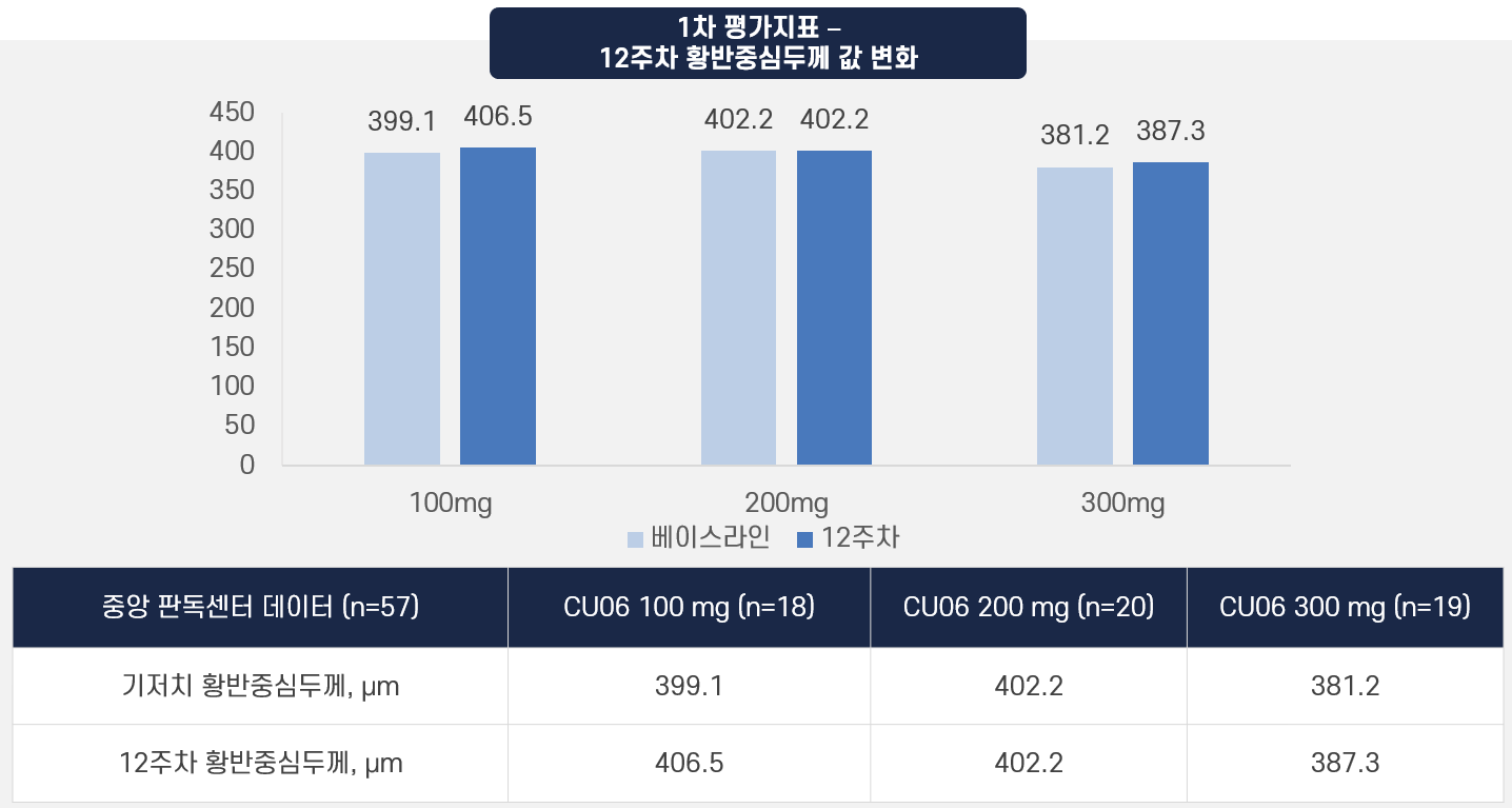 1차 평가지표로 사용된 황반중심두께(CST)는 부종의 측정하는 해부학적 평가지표 중 하나로, CU06은 12주 투여 후 베이스라인 대비 황반중심두께 값의 변화가 없어 부종을 악화시키지 않고 유지하는 것을 확인했습니다.
