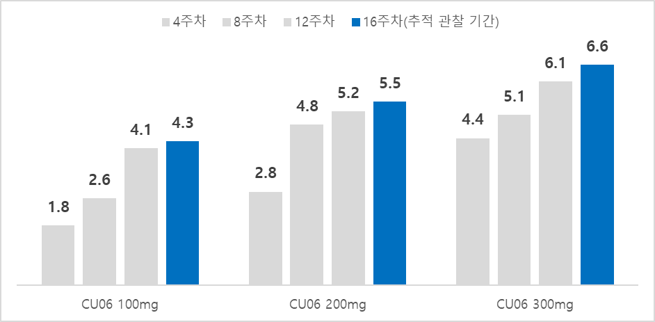임상2a상은 CU06 100, 200, 300mg을 12주간 투여하고, 약물 중단 후의 영향을 모니터링하기 위해 이후 4주간 투여를 하지 않는 추적 관찰 기간을 포함하여 디자인되었습니다.