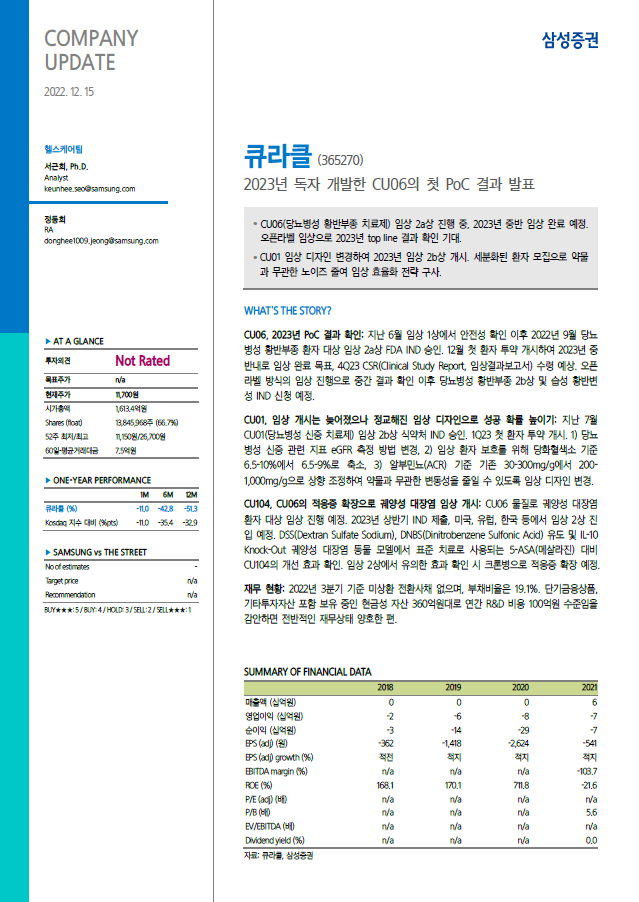 [레포트] 삼성증권 레포트 발간(2022.12) 2022-12-15 13:08:35 삼성증권_큐라클_20221215.pdf 금일 삼성증권에서 당사 리포트를 발간했습니다. 자세한 내용은 첨부파일에서 확인하실 수 있습니다. 감사합니다. 목록