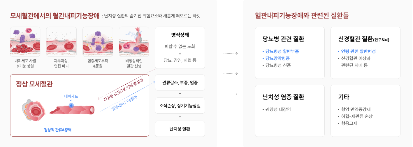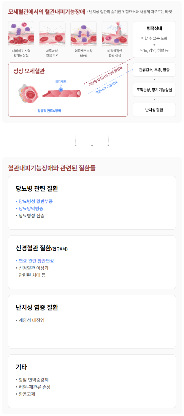 혈관내피기능장애는 노화 / 당뇨, 비만, 고혈압 등 만성질환 / 감염 등 병리적 환경으로 혈관이 손상되고, 혈관 내벽을 구성하는 혈관내피세포가 제 기능을 다하지 못하는 상태를 뜻합니다. 혈관내피기능장애는 난치성 혈관질환의 주요 발병 요인입니다.